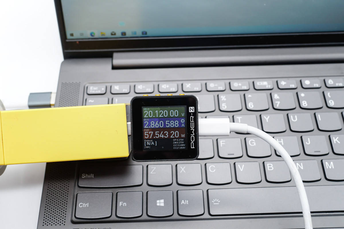 सबसे पहले, आइए फास्ट चार्जिंग पर नज़र डालते हैं। 20.12V 2.86A 57.54W की शक्ति के साथ लैपटॉप को चार्ज करने के लिए एक सीधे सिर चुंबकीय एडाप्टर के साथ एक 100W चार्जर का उपयोग करें।