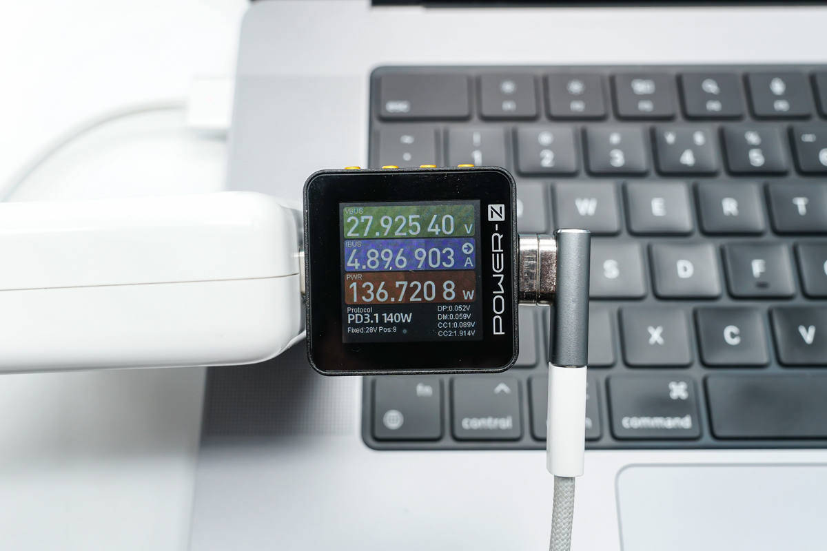 यहाँ तक कि।।। यह 140W फास्ट चार्जिंग का भी समर्थन करता है, और एडाप्टर ऐप्पल के 140W गैलियम नाइट्राइड चार्जर और मैगसेफ 3 फास्ट चार्जिंग केबल से जुड़ा हुआ है। इस समय, चार्जिंग वोल्टेज 28V है और पावर 135.72W है।