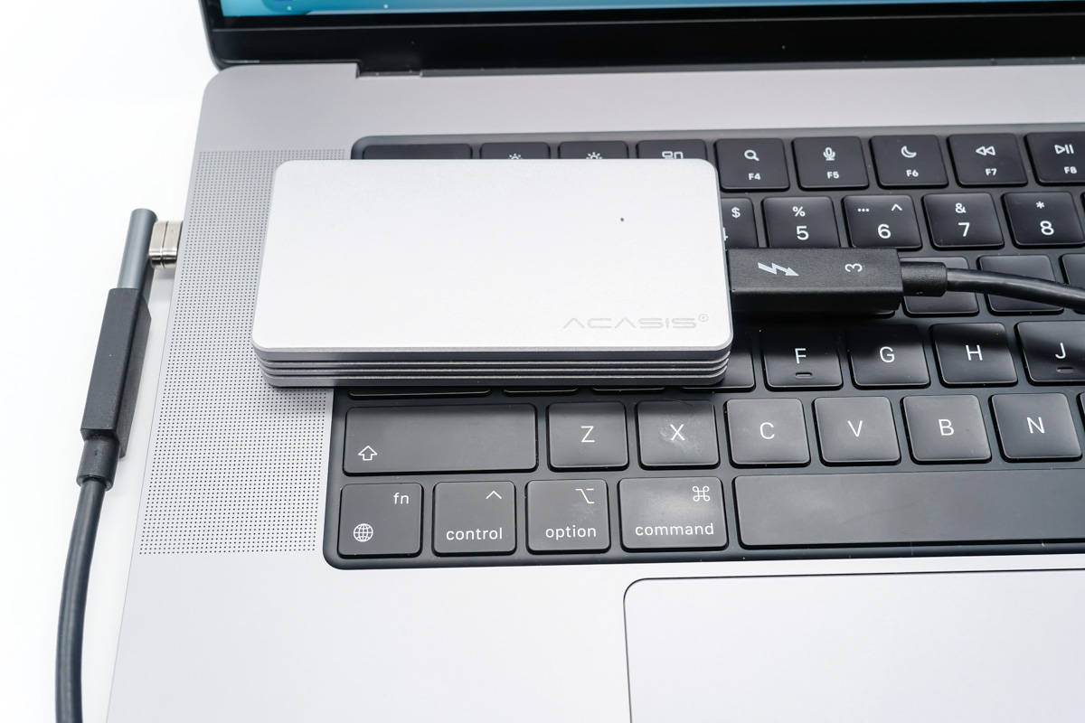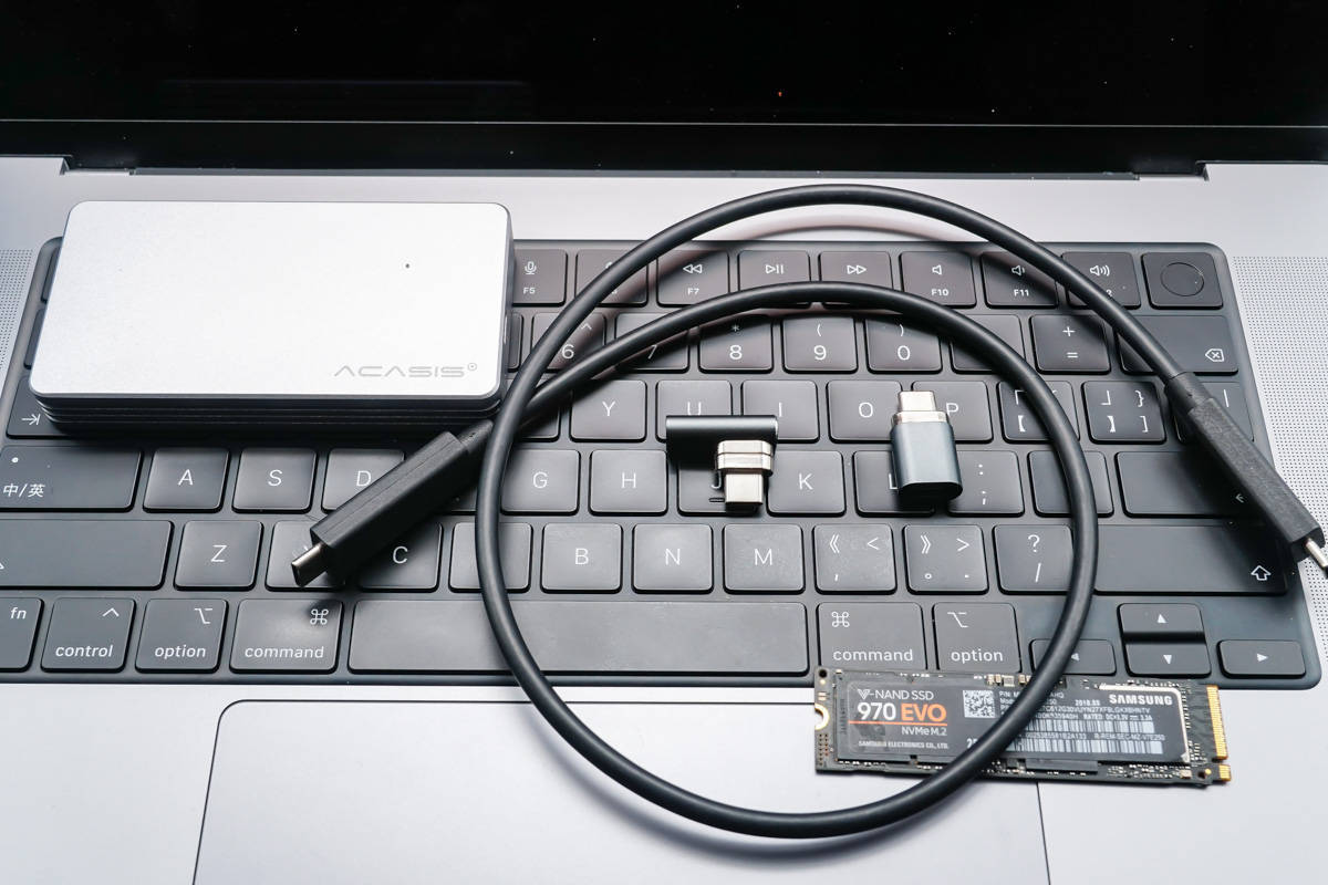 इसके बाद, आइए डेटा ट्रांसमिशन टेस्ट पर एक नज़र डालें। उपयोग किए जाने वाले उपकरण सैमसंग 970 ईवीओ सॉलिड-स्टेट ड्राइव, थंडरबोल्ट 3 हार्ड डिस्क बॉक्स, थंडरबोल्ट 3 डेटा केबल और दो एडाप्टर हैं।