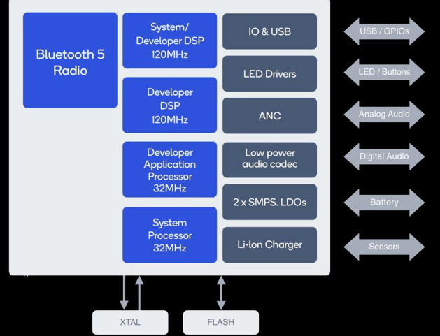 क्वालकॉम QCC5124 सिस्टम-ऑन-चिप (SoC) को लंबे समय तक ऑडियो प्लेबैक के लिए कम बिजली की खपत के साथ एक मजबूत, उच्च गुणवत्ता, वायरलेस ब्लूटूथ सुनने के अनुभव के लिए छोटे उपकरणों की जरूरतों को पूरा करने के लिए डिज़ाइन किया गया है। QCC5124 आर्किटेक्चर को कम बिजली की खपत के साथ उच्च प्रदर्शन के लिए डिज़ाइन किया गया है। अपनी पिछली तकनीक की तुलना में, बिजली की खपत को 65 प्रतिशत तक कम किया जा सकता है, जिससे लगभग सभी ऑपरेटिंग मोड में लंबे समय तक ऑडियो प्लेबैक सक्षम होता है।